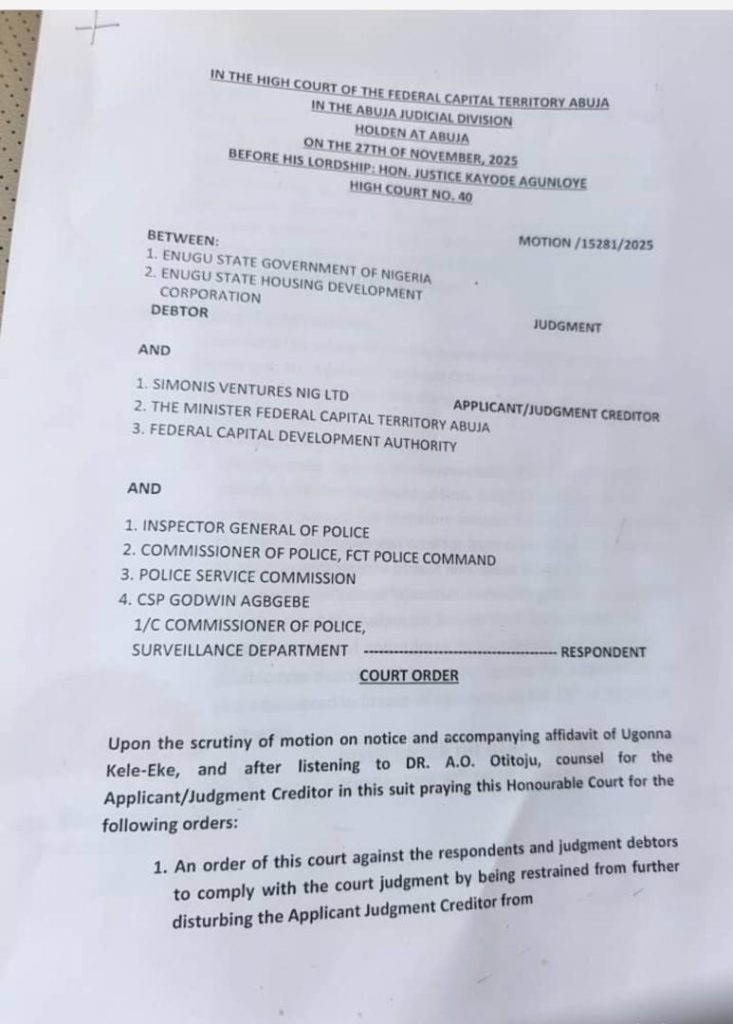 In 2025, Simonis Ventures returned to court, complaining of continued interference by Enugu State officials and alleged police harassment. On November 27, 2025, Justice Kayode Agunloye reaffirmed the earlier judgment and issued a perpetual injunction restraining the Enugu State Government, its agencies, and the police from disturbing the company’s possession and enjoyment of the land.