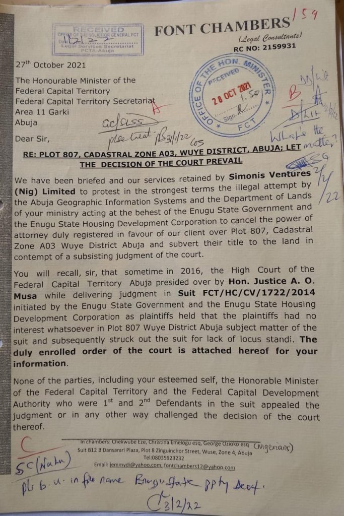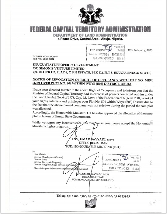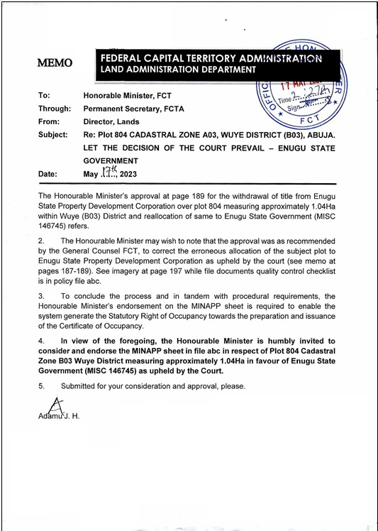 Court documents obtained by SaharaReporters and reviewed by SUNTV Global Channel show that on May 12, 2016, the FCT High Court, presided over by Justice O.A. Musa, ruled that the Enugu State Government and the Enugu State Housing Development Corporation had no legal interest in the disputed land, identified as Plot 804/807, Cadastral Zone A03, Wuye District, Abuja.