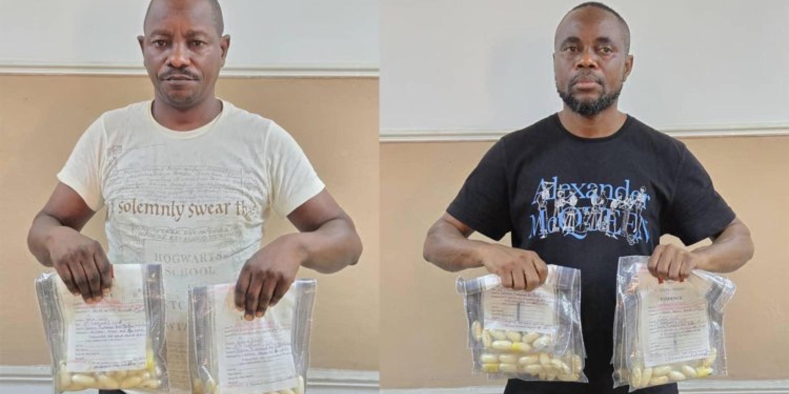 On the same day in Kano, two Angolan nationals, Mbandu Martins Makiadi, 50, and Ngoma Wilson Fernando, 52, were stopped at the departure hall while preparing to travel to Istanbul via Addis Ababa. Body scans confirmed ingestion of cocaine. Under supervision, Mbandu excreted 76 wraps weighing 920 grams, while Ngoma expelled 108 pellets totaling 1.33 kilograms.
