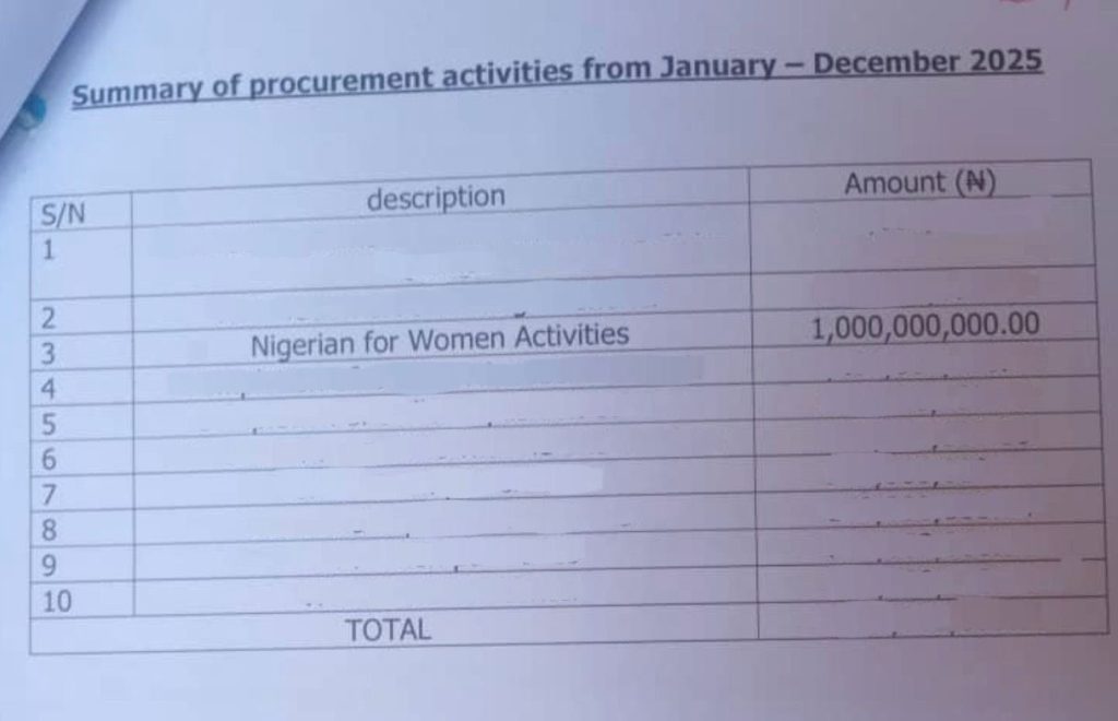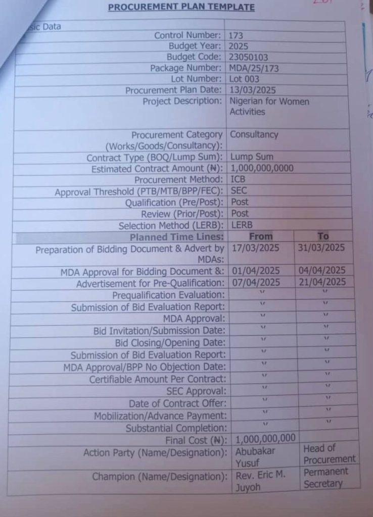 Reacting to the procurement document indicating a ₦1 billion consultancy, Sinjen denied knowledge of the record, insisting it did not originate from her ministry.