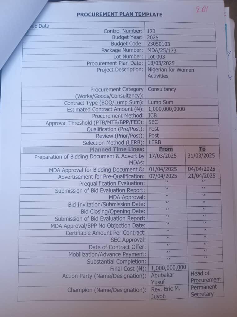 Documents reviewed by SUNTV Global include a Taraba State Procurement Plan Template for 2025, which lists a consultancy package under the Nigeria for Women Project with an estimated contract value of ₦1,000,000,000, categorised as a lump-sum consultancy with international competitive bidding.