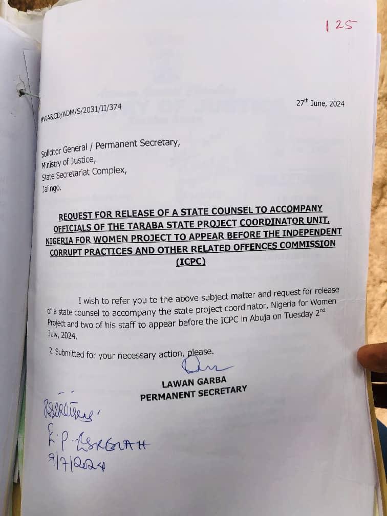SUNTV Global obtained a letter dated June 27, 2024, signed by Lawan Garba, Permanent Secretary of the Taraba State Ministry of Justice, requesting the release of a State Counsel to accompany the NFWP Project Coordinator and two staff members to appear before the ICPC in Abuja.